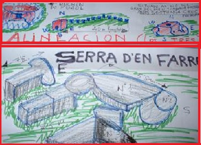 Al meu presentat dibuix inferior, hi ha la cambra del gran dolmen del PUJOL, amb la indicació "SERRA del FARRE" escrit al damunt, perque és cap a on la alineació dels monuments megalitics esmentada té el seu destí final. Encara manca esbrinar, però, quínes foren les intencions de llurs constructors.
